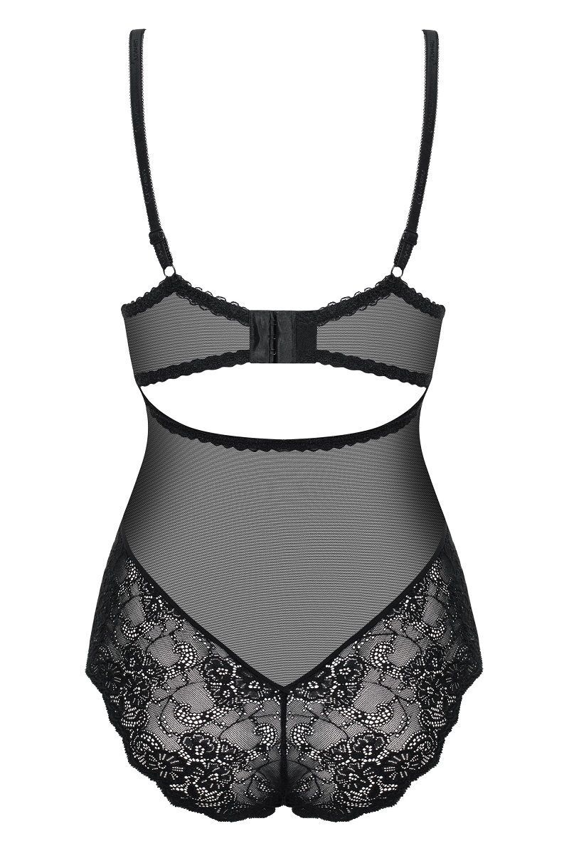 Боди Amallie выполнено из эластичной ткани в сочетании с полупрозрачными вставками. Комбинированные чашечки на косточках, верх выполнен из кружевного полотна, а низ на тонком поддерживающем поролоне. Бретели и регулируются по длине, на спинке застежка на крючки-петли.