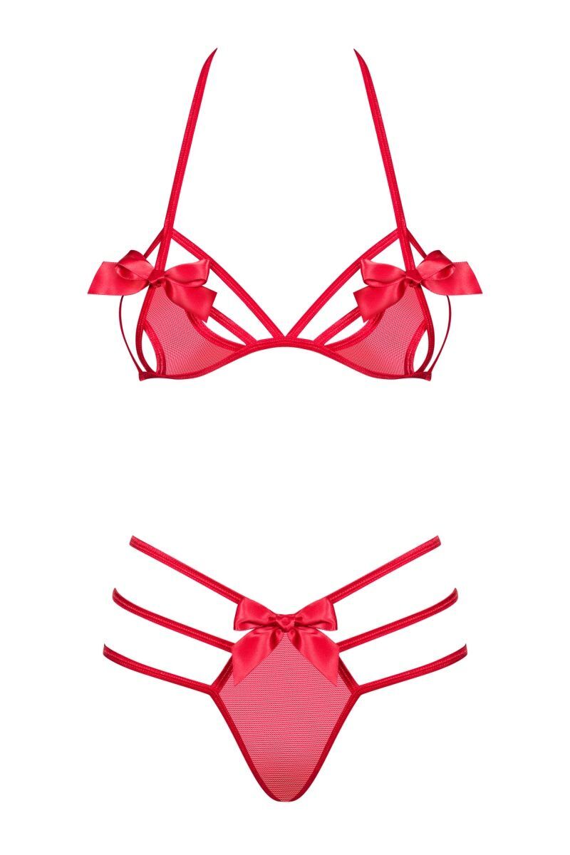 Уникальный комплект белья Giftella состоит из полуоткрытого бюстгальтера и трусиков. Бюстгальтер мягкий без косточек, фиксируется на завязки за шеей и на спинке. Комплект декорирован бантиками. В комплекте: бюстгальтер, трусики.
