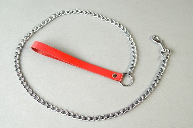 Металлический поводок на кожаной лаковой ручке. Может использоваться вместе с ошейником, наручами, поножами, всевозможными сбруями и т.д. Поводок снабжён удобной для захвата кожаной ручкой. Длина цепи — 80 см.