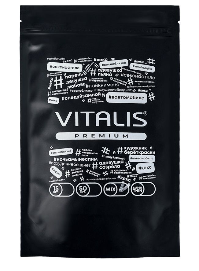 Попробуйте все виды элитных немецких презервативов VITALIS premium и получите незабываемое удовольствие! 3 штуки презервативов VITALIS SUPER THIN в подарок! В упаковке 10 видов презервативов: 1. Цветные и ароматизированные — помогут внести разнообразие в любовную жизнь! 3 аромата: черный — шоколад, красный — клубника, желтый — банан. 2. Анатомической формы — контурный презерватив расширен в области головки, что дает повышенный комфорт посадки. 3. Охлаждающий — продлевает эрекцию, даря восхитительное наслаждение. 4. Классический — прозрачный презерватив классической формы со смазкой без запаха. 5. Ребристый — ребристая поверхность стимулирует эрогенные зоны женщины. 6. С кольцами и точками — для максимальной стимуляции обоих партнеров. 7. Согревающий — согревающая смазка усиливает чувствительность. 8. С утолщенной стенкой — утолщенная стенка 0,09 мм создана для любителей экспериментов в постели. 9. Супертонкий — утонченная стенка сделает секс максимально чувственным и естественным. 10. Увеличенный — презерватив шириной 57 мм и длиной более 190 мм.