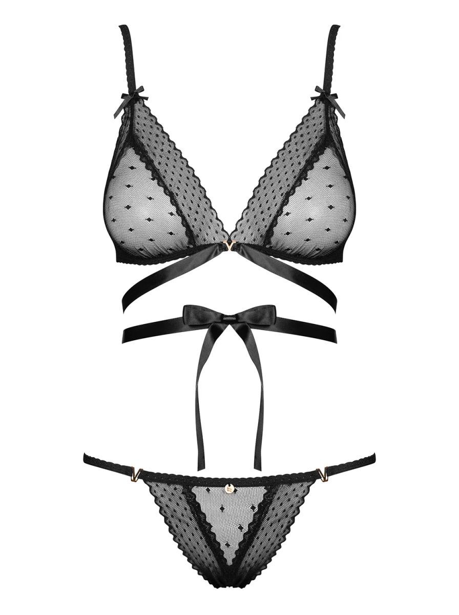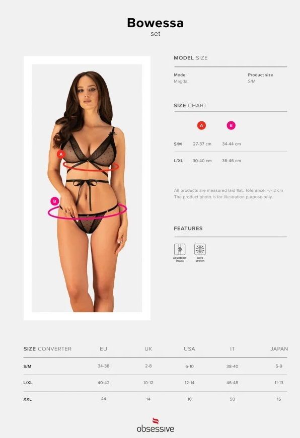 Феноменальный комплект нижнего белья Bowessa из полупрозрачного тюля в горошек. Комплект состоит из бюста и стрингов. Бюст с мягкими чашками без косточек, украшен бантиками и красивой подвеской. Бретели регулируются по длине. Красивая атласная лента обвивается вокруг тела и завязывается бантом спереди. Изделие упаковано в плотную красивую коробку и отлично подойдет в качестве оригинального подарка. В комплекте: бюстгальтер, трусики-стринги.