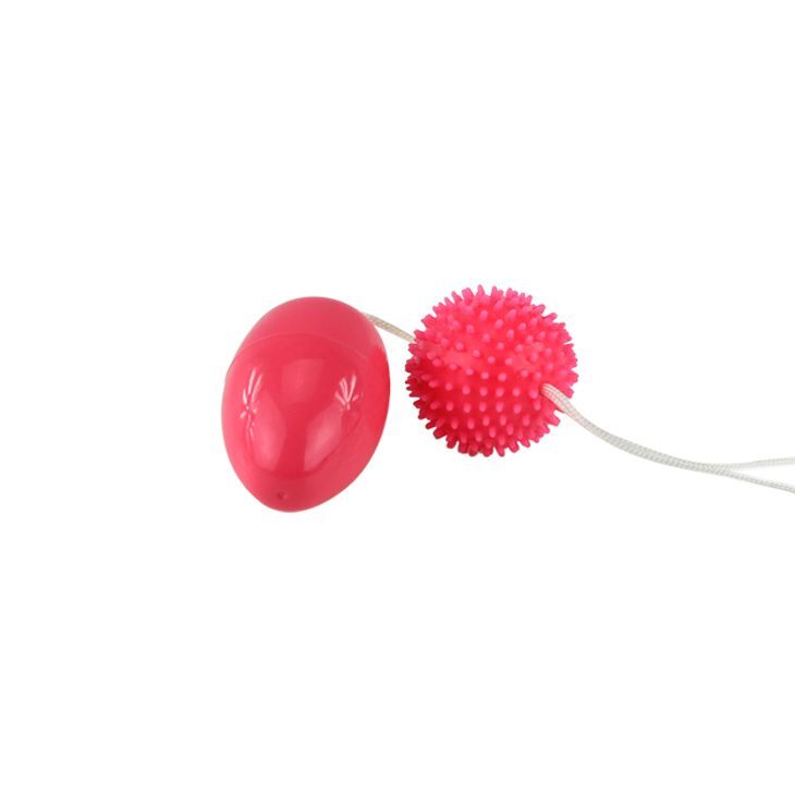 Комбинированные анальные шарики. Один шарик из термопластичной резины, покрыт пупырышками, а другой гладкий, продолговатый - из анодированного пластика. Длина шарика-ёжика - 3,7 см., диаметр - 3,4 см. Длина яичка - 5,5 см., диаметр - 3,4 см.