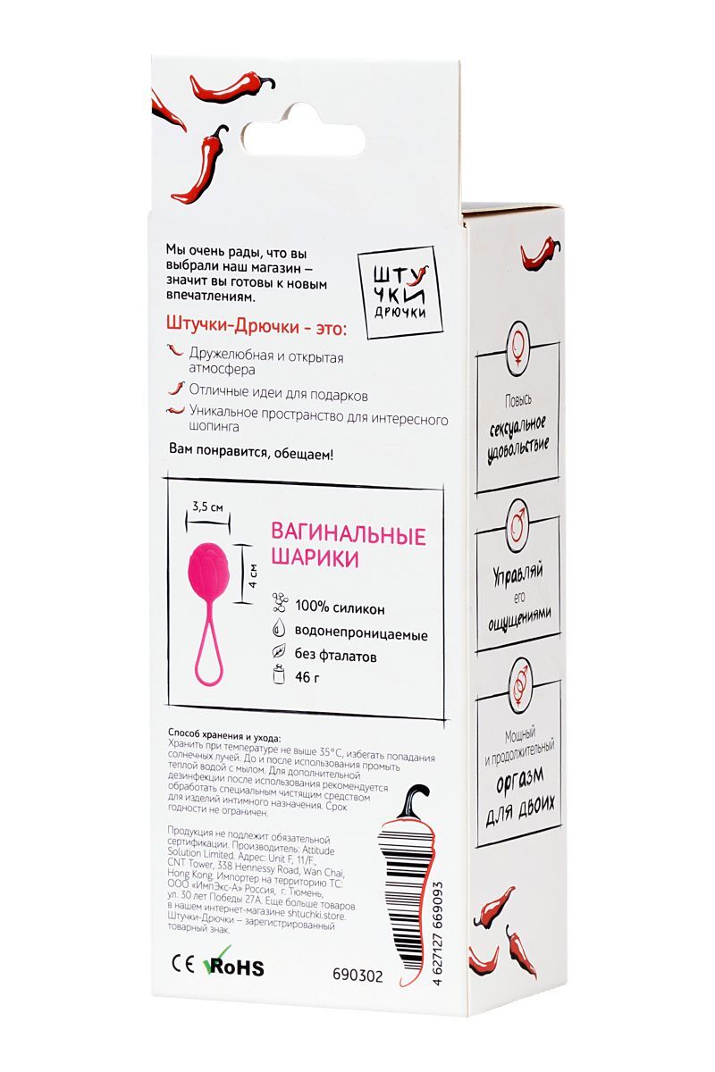 Я - вагинальный шарик Штучки-Дрючки, лучший тренажер для интимных мышц. Я полностью состою из медицинского силикона, поэтому тренироваться со мной не только удобно, но и безопасно. У меня смещен центр тяжести, что позволяет проводить тренировки с большей эффективностью. Я легко составлю тебе компанию дома во время уборки и даже в офисе во время скучного совещания. Всего за пару месяцев ты укрепишь интимные мышцы и сделаешь их более упругими, а в качестве бонуса получишь умопомрачительный секс и огромное количество оргазмов. Рабочая длина - 4 см.