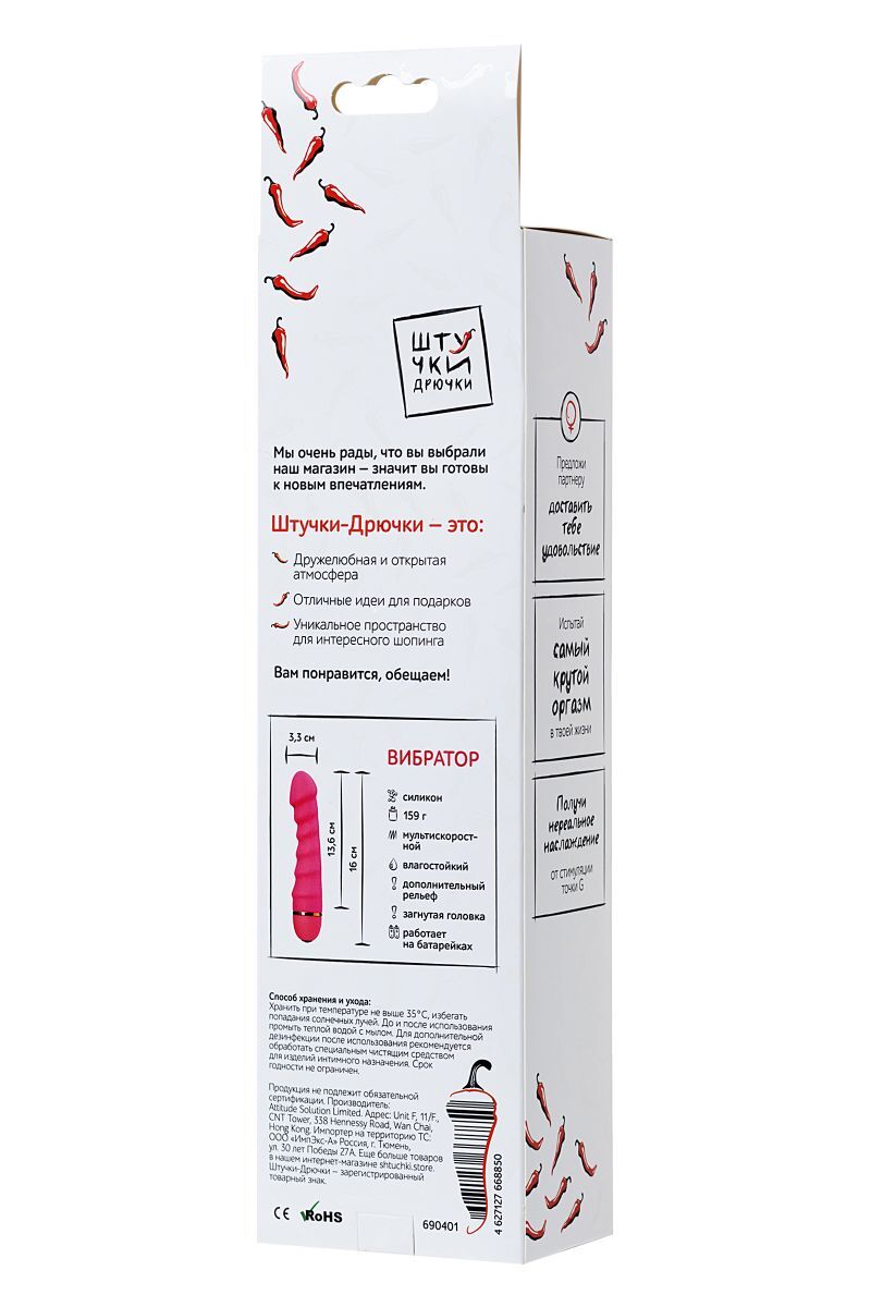 Вибратор обладает интересным дизайном и выдающейся формой, которая обеспечит незабываемые ощущения. Имеют 20 режимов вибрации, которые удобно регулируются кнопкой в основании игрушки. Изготовлены из высококачественного и приятного на ощупь, бархатистого силикона. Вибраторы Штучки-дрючки созданы для того, чтобы доставить незабываемое удовольствие! Рабочая длина - 13,6 см. Минимальный диаметр - 2,8 см.