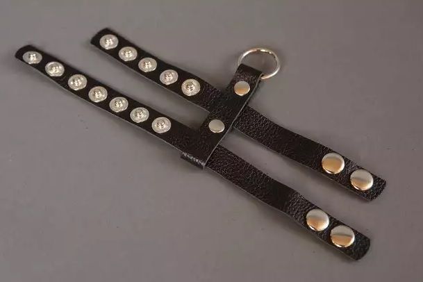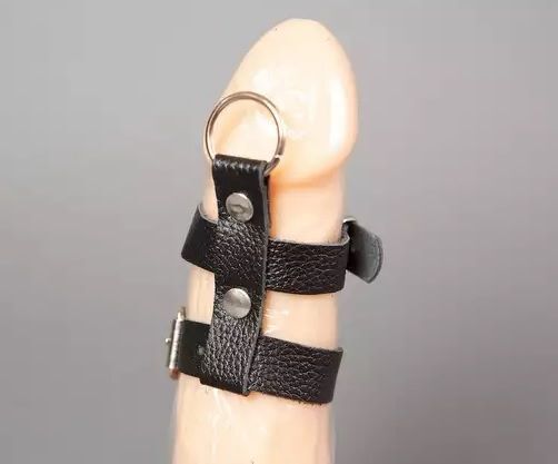 Сбруя на пенис выполнена из высококачественной натуральной кожи мягкой выделки. Состоит из двух колец одно на пенис и одно под мошонку. Кольцо позволяет пристёгивать поводок или различные карабины. Размер регулируется.