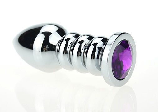 Серебристая фигурная анальная пробка с фиолетовым кристаллом - 10,3 см.