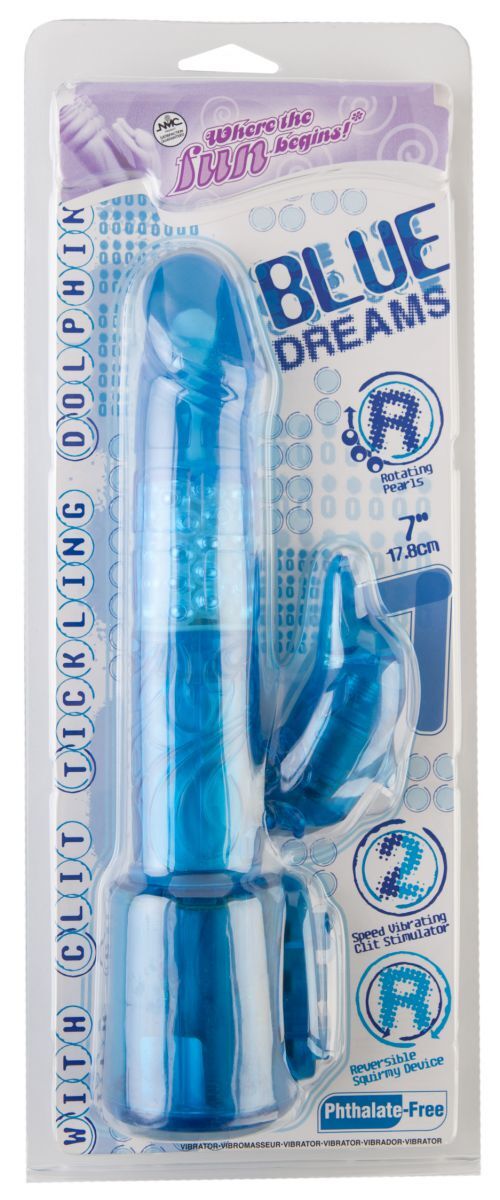 Синий вибратор с клиторальным стимулятором-дельфином - 17,8 см.