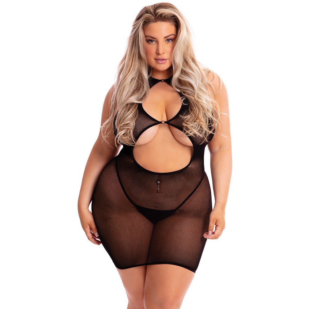 Эротическое мини-платье из полупрозрачного трикотажного полотна. Фантазийный вырез на груди и открытая спинка.
