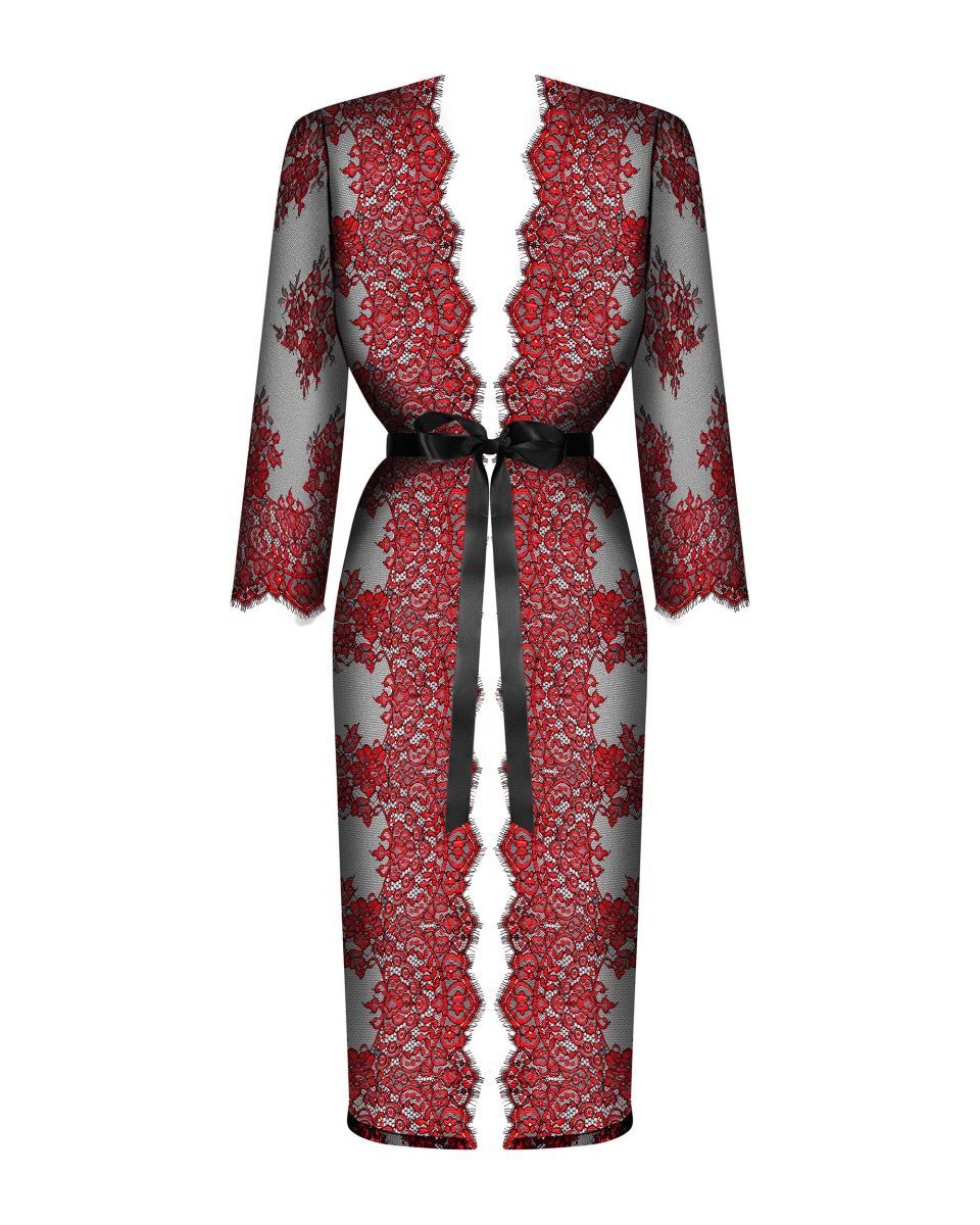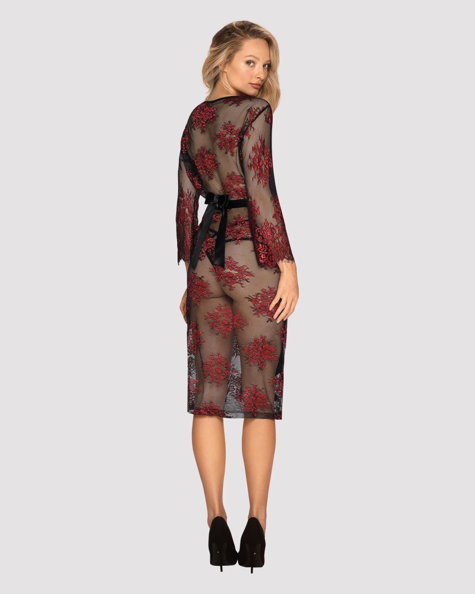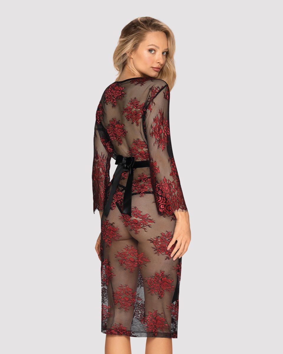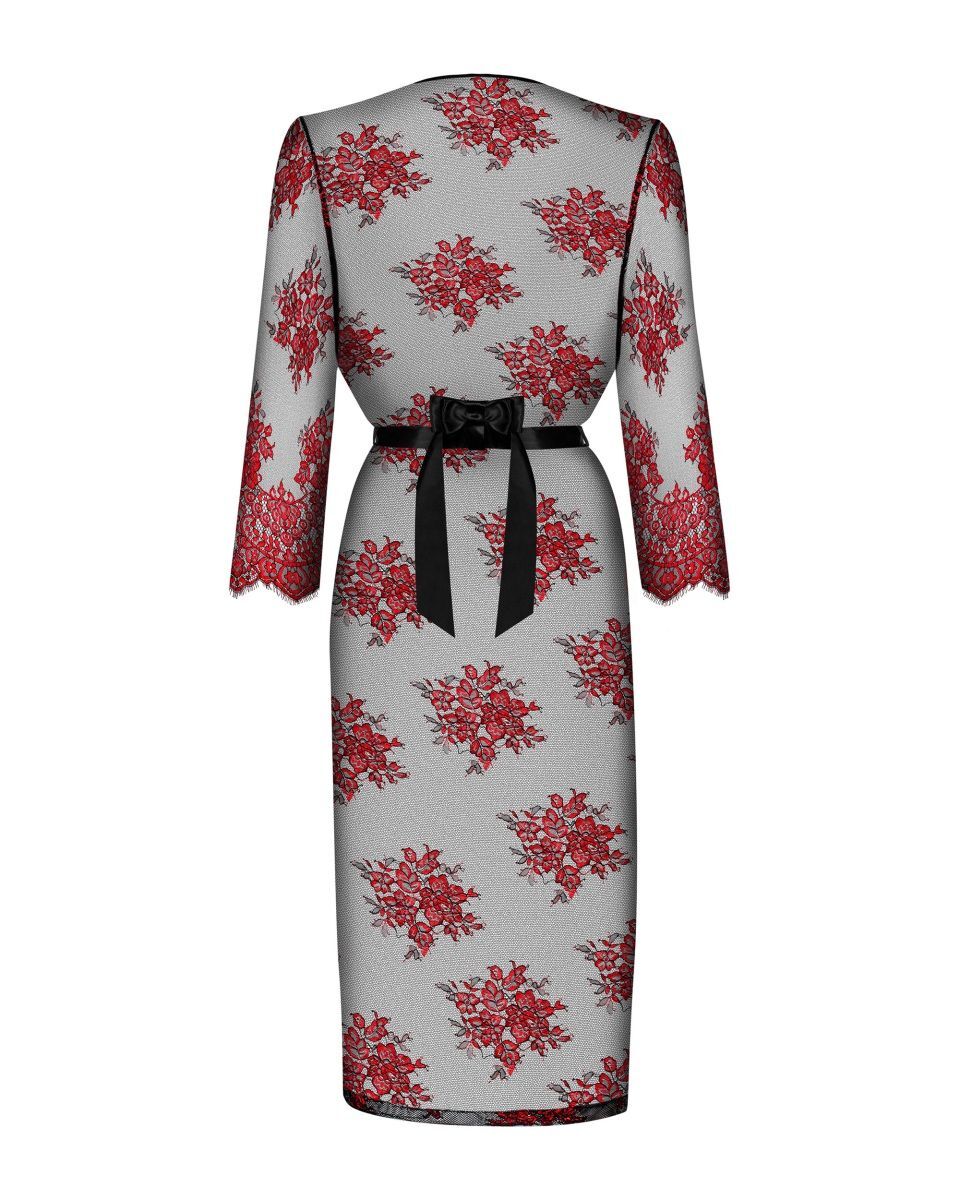 Восхитительный длинный пеньюар из коллекции Redessia из прозрачного кружева с цветочным рисунком, на талии пояс из атласной ленты, рукава длинные, края с ресничками.