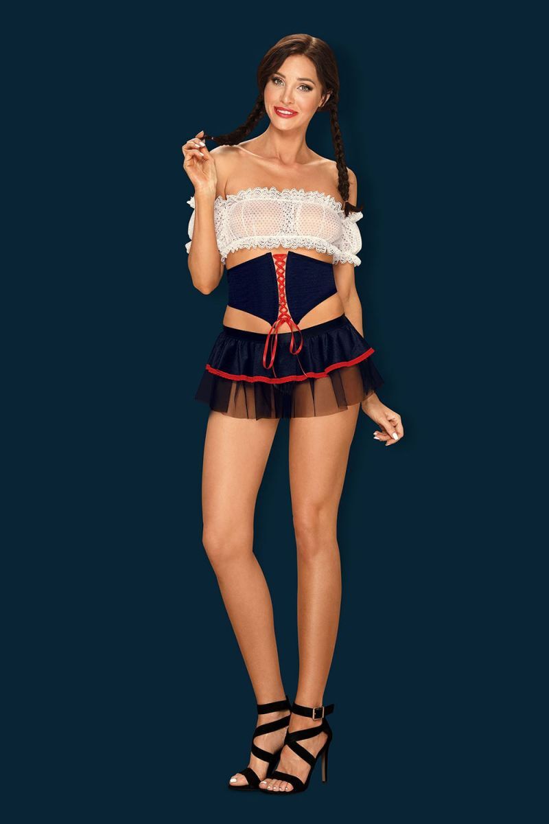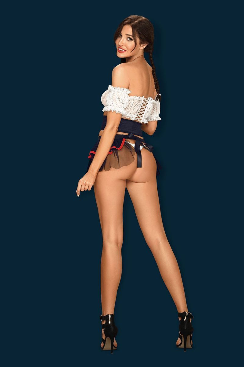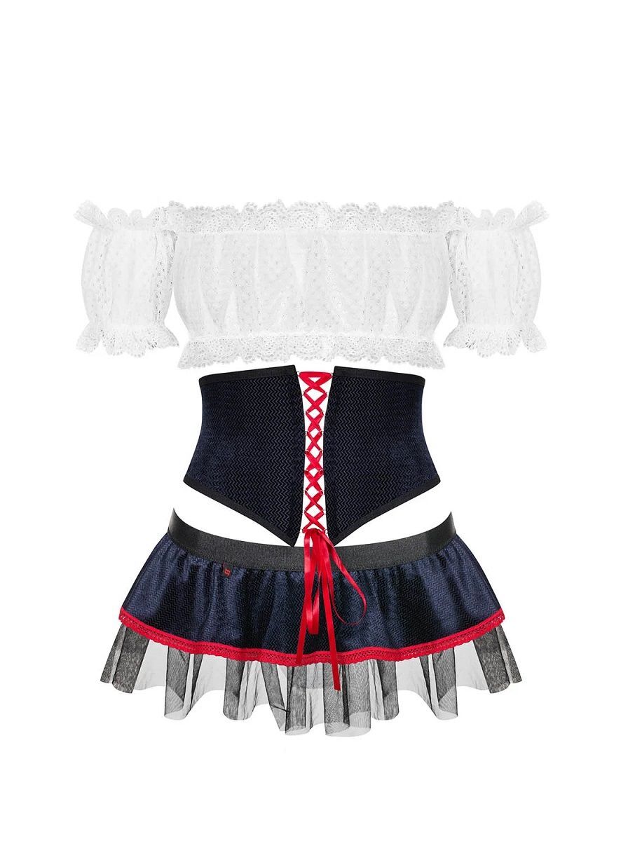 Соблазнительный костюм славянки состоит из пяти частей. Полупрозрачный топ-бюстгальтер с принтом в мелкий горошек, на спинке очаровательная шнуровка. Два коротких рукава, которые не соединены с топом. Широкий пояс с красной шнуровкой. Короткая юбка с рюшами очень кокетливо ниспадает на бедра, сзади завязывается на атласные ленты. В комплекте: топ-бюстгальтер, 2 рукава, пояс, юбка, трусики-стринги.