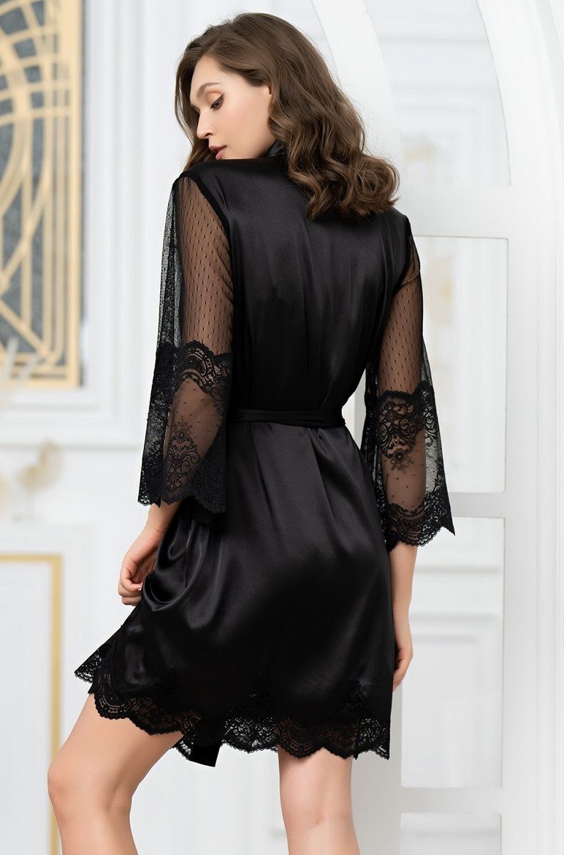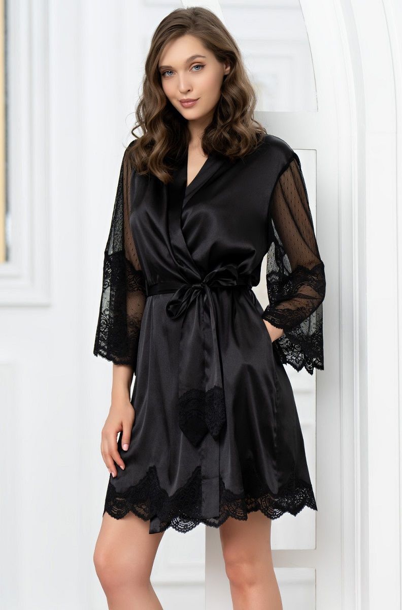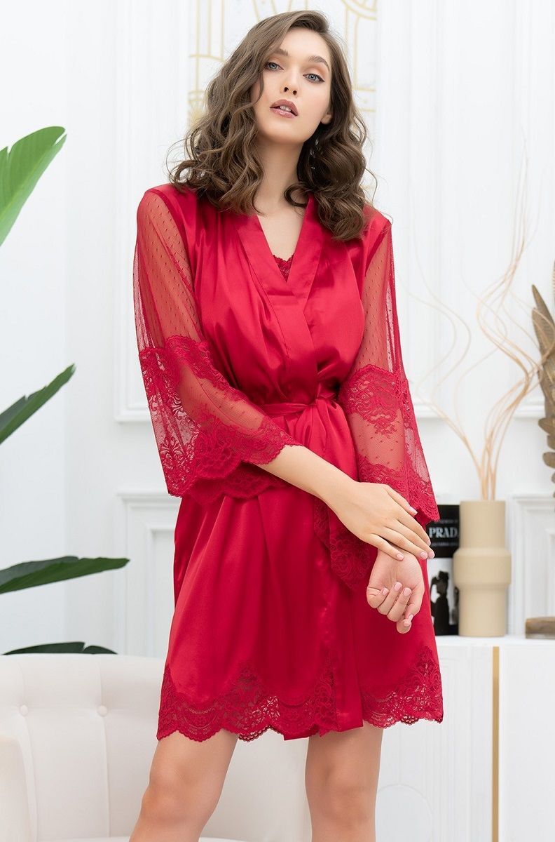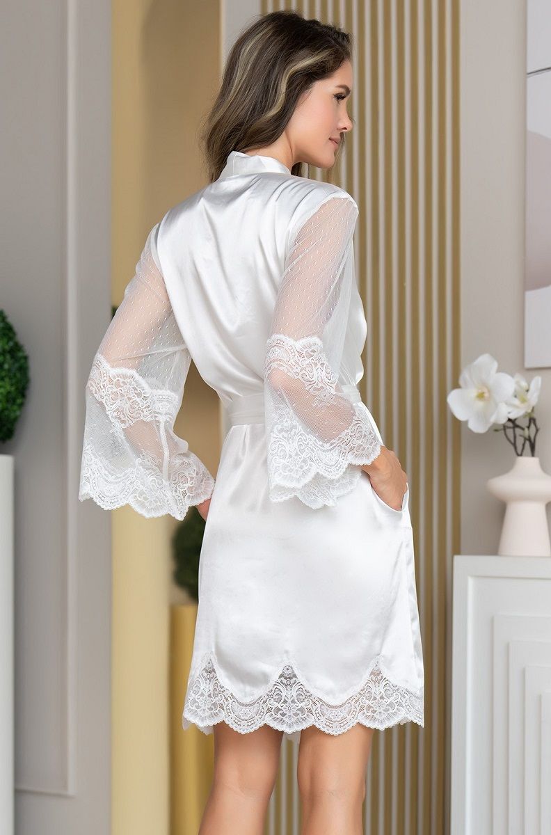 Короткий запашной халат с длинными полупрозрачными рукавами. Халат выполнен из однотонного смесового шелка и декорирован ажурным кружевом, которое расположено по низу рукавов и низу изделия. По бокам обработаны карманы. Концы широкого пояса украшены кружевом.