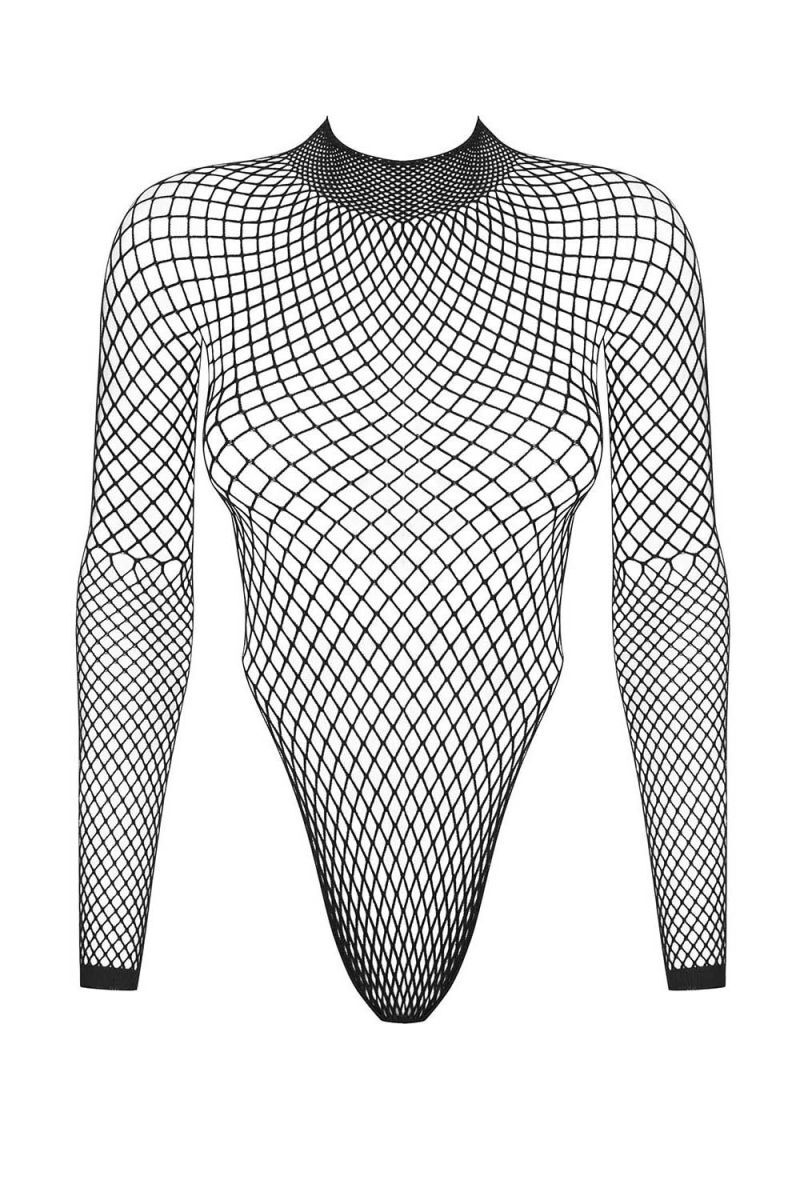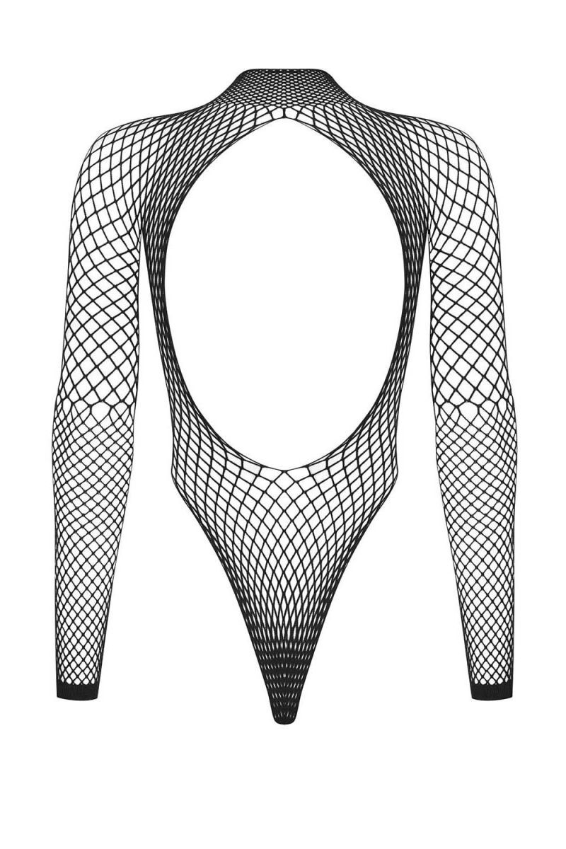 Женская боди-сетка с длинными рукавами и фигурным вырезом на спинке.