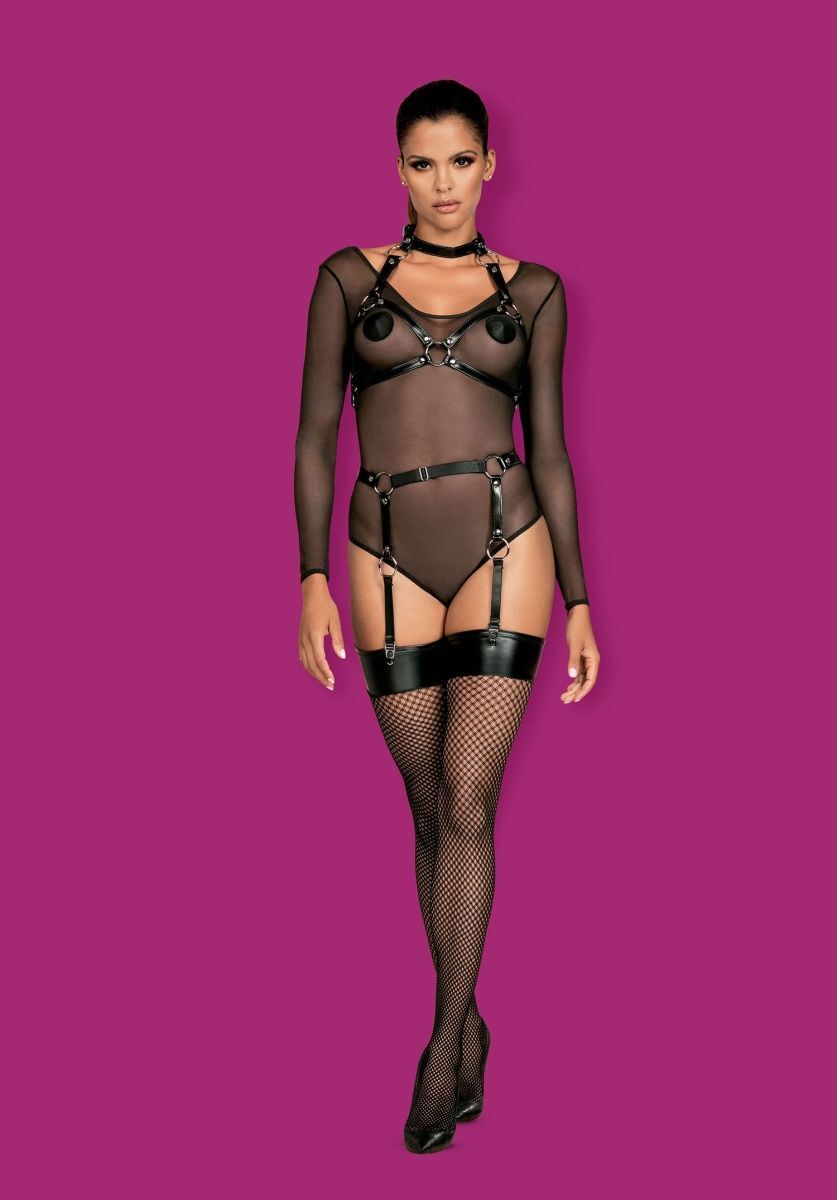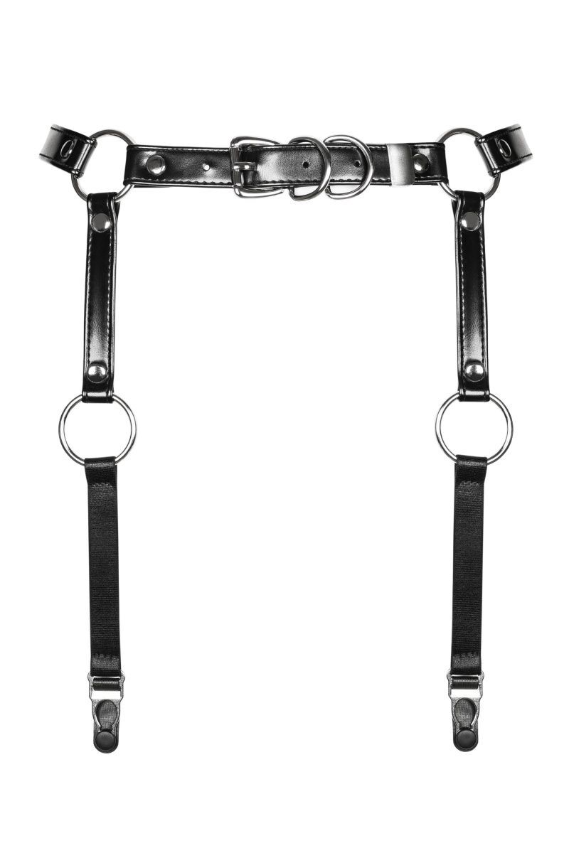 Пояс для чулок из материала, имитирующего кожу. Изготовлен из прочных ремешков, соединенных металлическими кольцами. Спереди эластичный регулируемый пояс, сзади застежка для наилучшей посадки по фигуре.