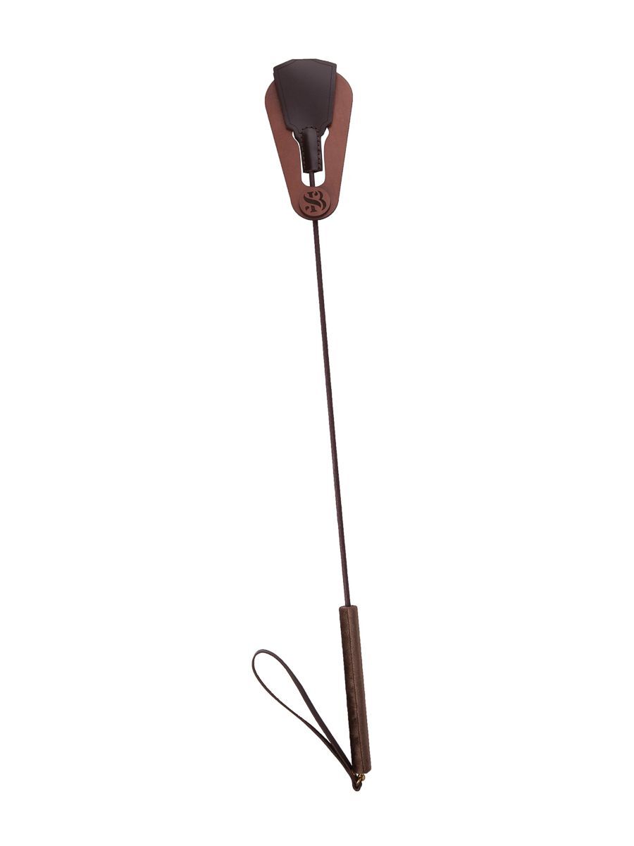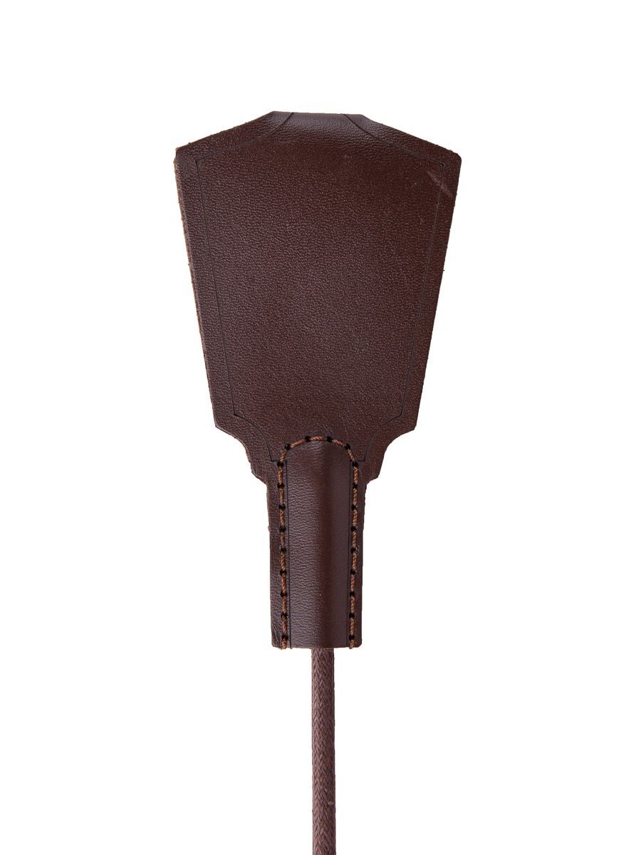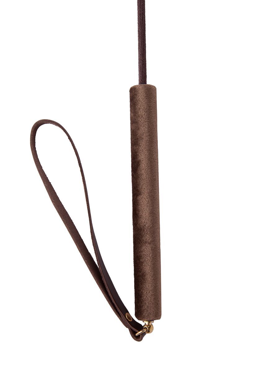 Стек Готика представлен в виде роскошного, изящного изделия цвета темного шоколада. Петлеобразная хлопушка стека изготовлена из натуральной кожи высокого качества, располагается на конце гибкого, но прочного хлыста. Комфортное использование девайса обеспечивает бархатистая рукоять, покрытая велюровой тканью. Ремешок-петля, находящийся на рукояти, позволяет дополнительно фиксировать стек на запястье. Длина рукояти - 17 см. Длина хлопушки - около 13 см.