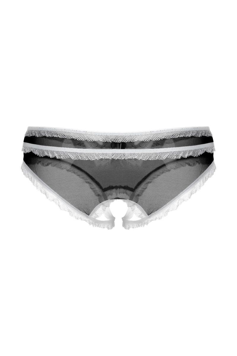 Эти очаровательные трусики из сетки говорят без слов: «Любимый, я так тебя хочу!». Виной тому пикантный вырез, открывающий часть ложбинки попки и все прелести в самом низу живота. Пышные рюши из сетки контрастного цвета придают и без того смелому образу кокетливости и озорства.