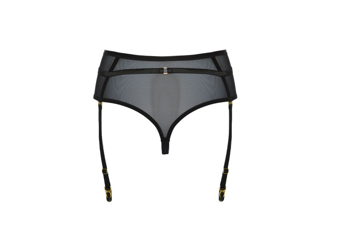 Трусики-стринги с пажами Sono с завышенной талией выполнены из эластичной сетки, декорированы тонкими эластичными резинками. Пажи для чулок съемные, регулируются по длине, фурнитура металлическая цвета золота. Ластовица из 100% хлопка. Внимание: европейские размеры! Для определения российского размера необходимо прибавить 6!