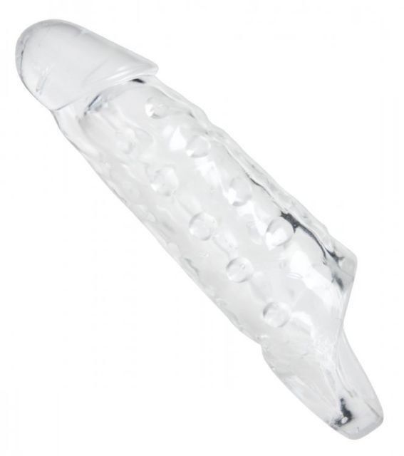 Этот гладкий, прозрачный усилитель длины имеет удерживающий ремешок для мошонки. Фаллическая насадка приятно обхватывает пенис, добавляя ему длину и объем. Материал гелевый, эластичный, хорошо тянется, не содержит фталата. Размеры: 20 см общая длина (с ремешком), вставная длина 14 см, 6,5 см - внешний диаметр.