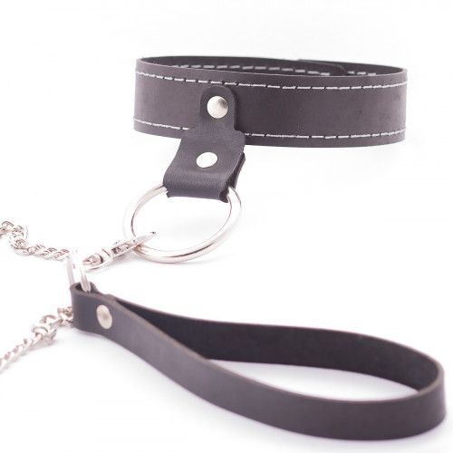 Узкий однослойный ошейник с поводком. Ошейник выполнен из натуральной кожи и имеет кольцо для крепления поводка. Ширина ошейника - 3 см. Длина ошейника - 38 см. Длина поводка - 80 см.