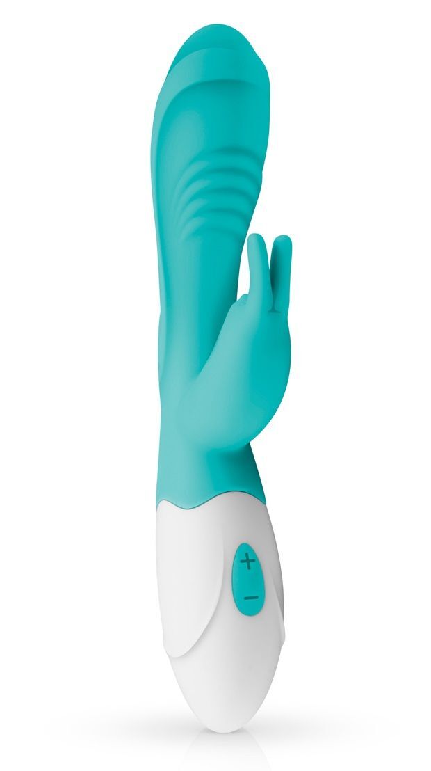 Зеленый вибратор с клиторальным зайчиком Leda. Перезаряжаемый. Со стимулирующими ребрышками на поверхности ствола. 10 режимов вибрации. Рабочая длина - 10 см.
