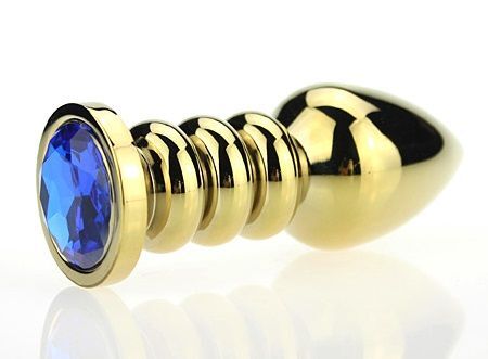Золотистая фигурная анальная пробка с синим стразом - 10,3 см.