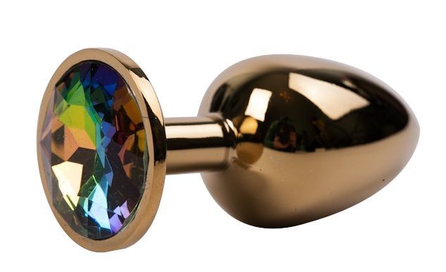 Золотистая металлическая анальная пробка с радужным стразом - 7,6 см.